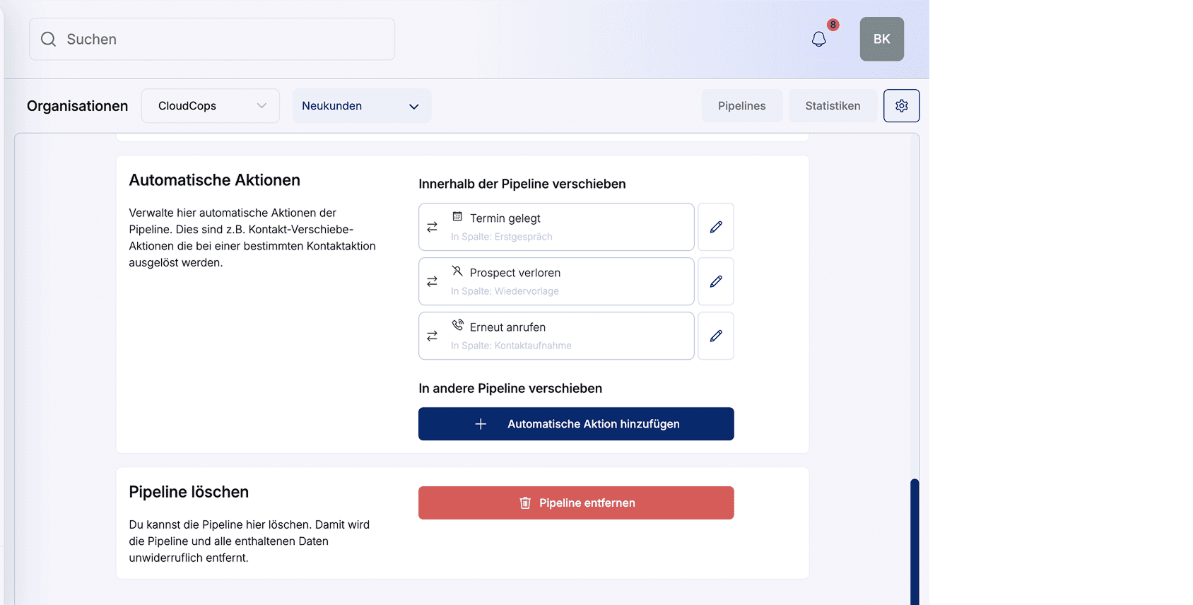 Deine komplette Kundenreise, visualisiert: Vom Lead bis zum Abschluss – mit klaren Stufen und automatisierten Prozessen.