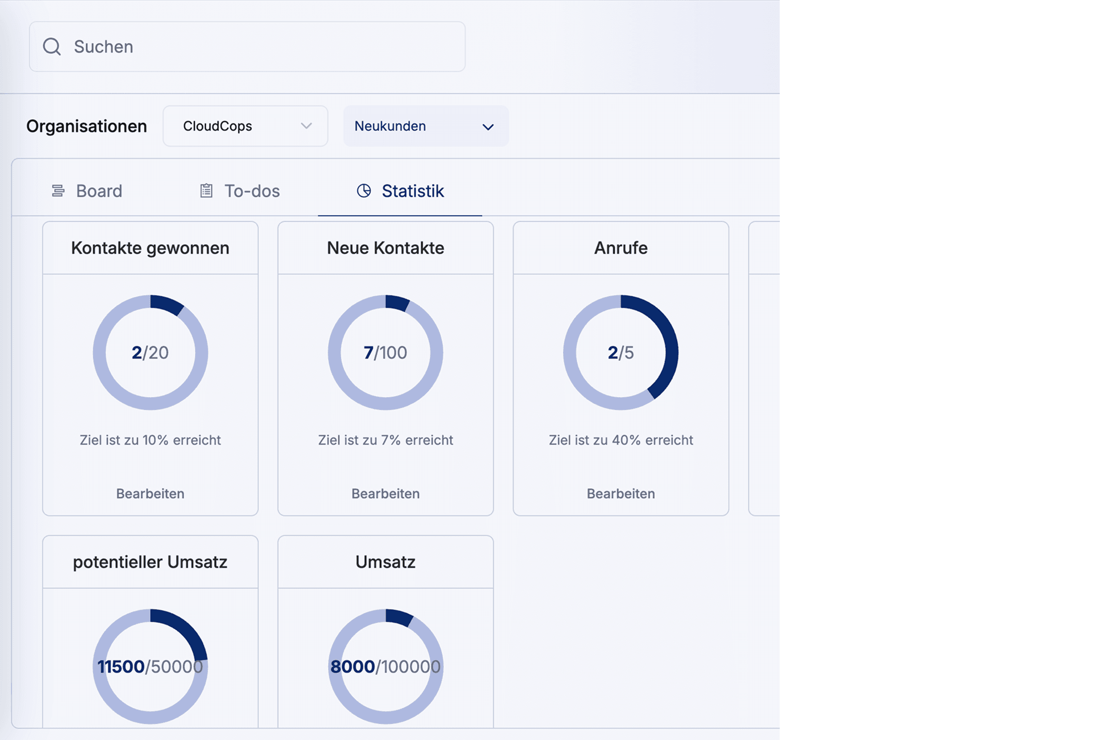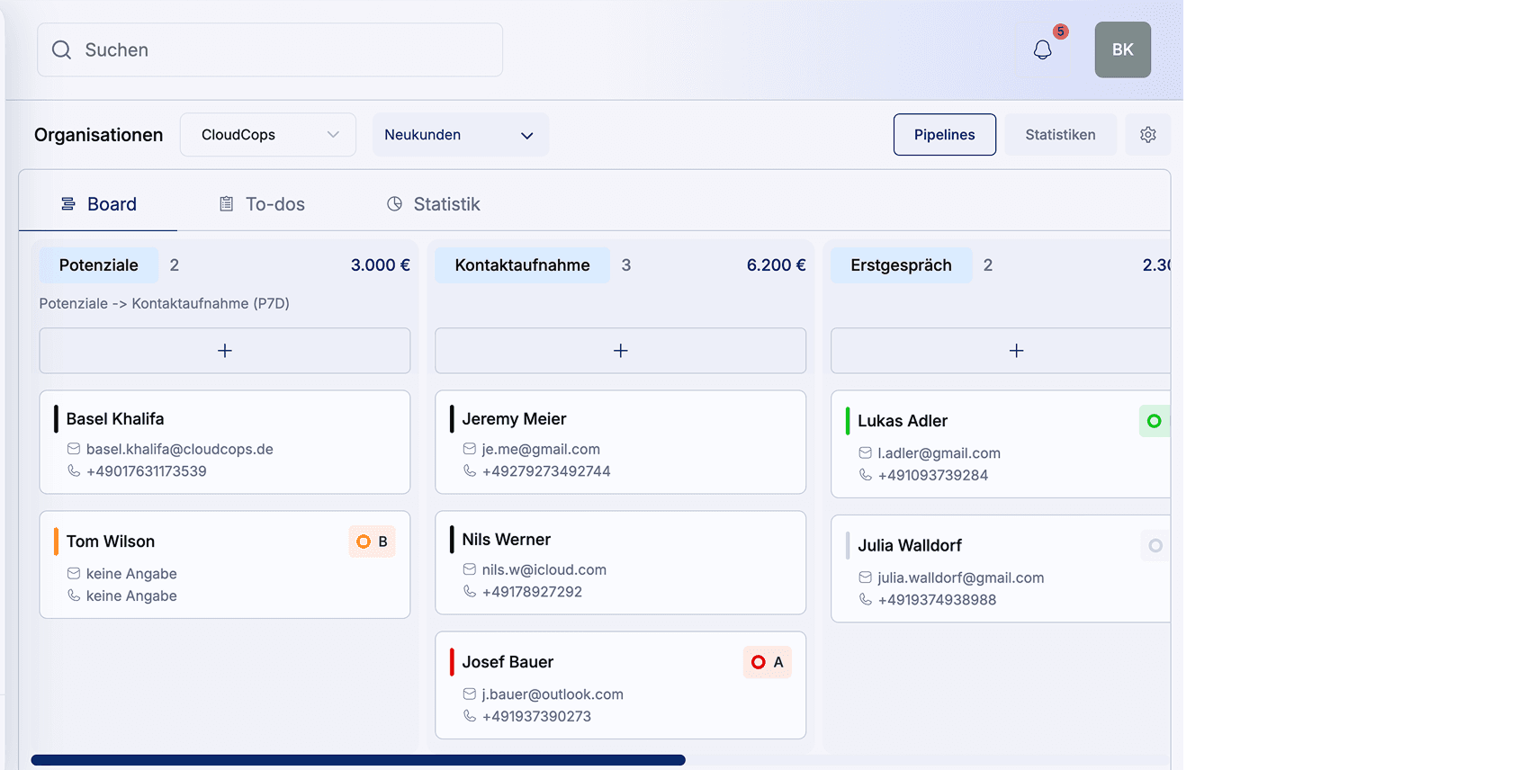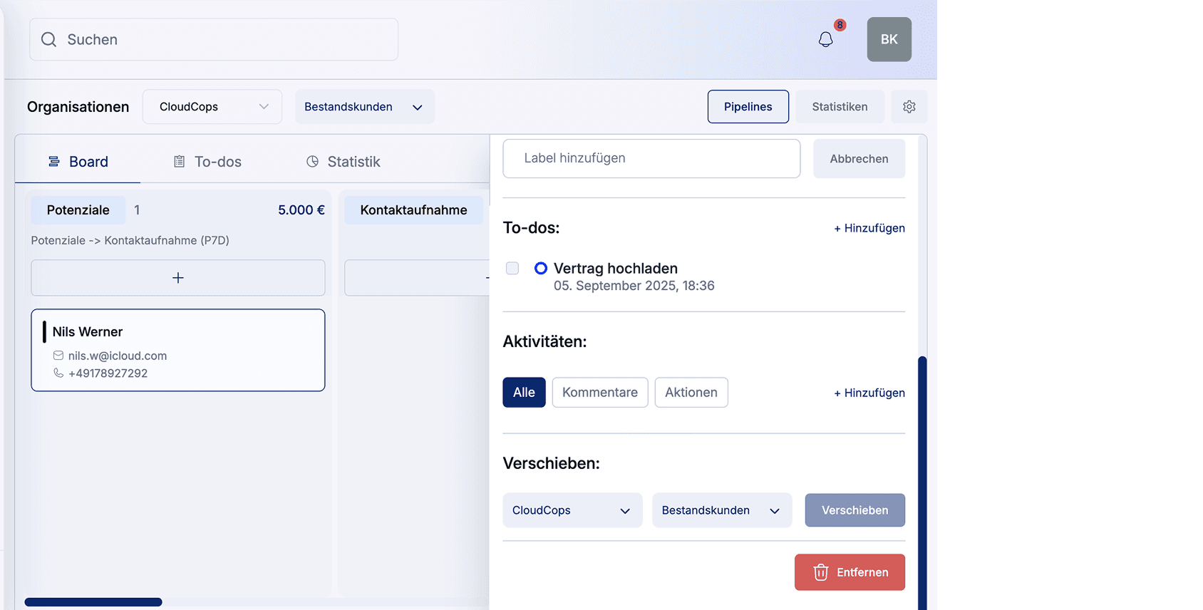 Führe Neukunden reibungslos in Bestandskunden über und berate kontinuierlich weiter. Standard-Setup für beide Welten: vom Erstkontakt bis zur Pflege, damit das Bestandskundengeschäft sichtbar bleibt, Chancen geplant werden und Beziehungen über Workflows systematisch weiterwachsen.